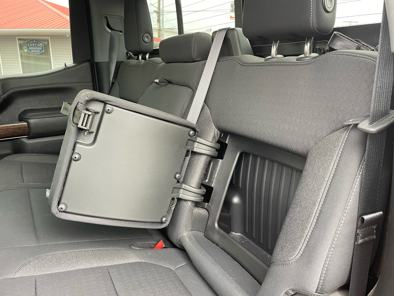 • Seat, Cloth Rear with Storage Package, 60/40 folding bench for Crew Cab models, includes seatback storage on left and right side, center fold out armrest with 2 cupholders, (includes child seat top tether anchor)